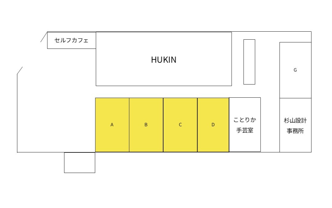 A〜Gの7つの区画があり、それぞれ約13㎡の広さがあります。アトリエとしての制作活動や、スモールスタートのショップとして活用など、柳ヶ瀬商店街に拠点を置き活動したい方向けの賃貸です。